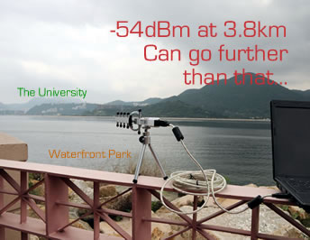 However, the catch was that the nearest WiFi network was 300 meters away, not that the internal WiFi of our laptops could cater for. We brought along with our strongest +18dBi Yagi antenna, at about 1 meter long with pole mounting. It was a highly directional antenna with a narrow beaming aperture. So when we held it in our hands, the signal strength climbed to the peak in one direction. As our hands got tired and move slightly away from it the signal dropped sharply. The signal also wobbled when vehicles passed by since it is too focused to get distracted. We couldn't put it on the roof under restricted access, and it could have taken a long and costly RF cable with lightning arrestor even if we were able to do so.